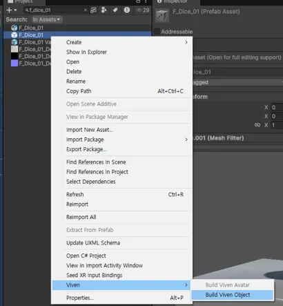 만들어진 F_Dice_01을 우클릭한 후 Viven→BuildVivenObject 버튼을 클릭합니다.