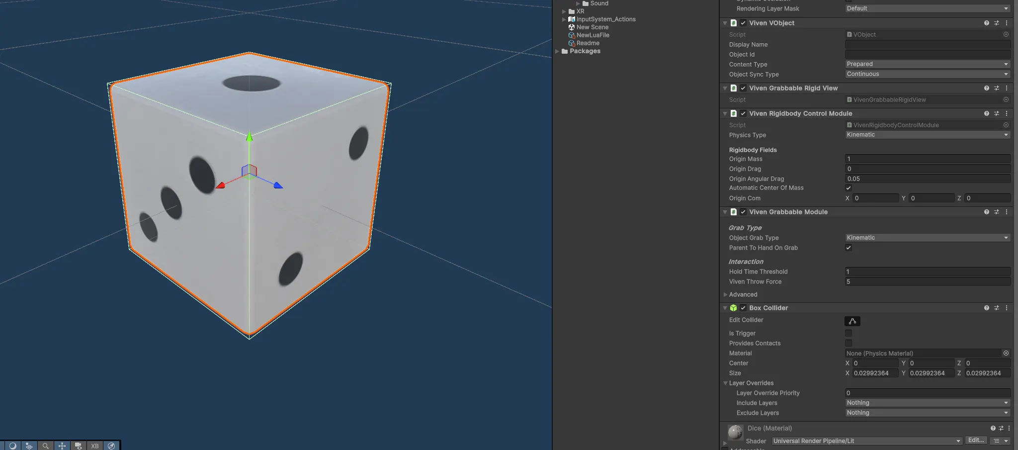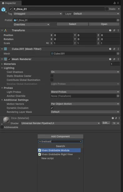 플레이어가 주사위와 상호작용할 수 있게 만드려면 Viven Grabbable Module을 추가합니다.