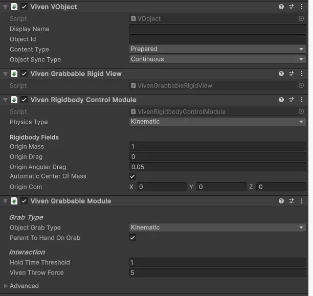 GrabbableModule이 추가되면 PC/VR환경에서 물체와 상호작용할 수 있습니다. 물체의 물리적 상태는 네트워크를 통해 동기화되며, VivenRigidBodyControlModule 컴포넌트에서 물리와 관련된 설정을 변경할 수 있습니다.