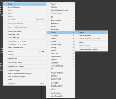 Project 칸에서 마우스 오른쪽 버튼을 클릭 → Create → Scene → Scene