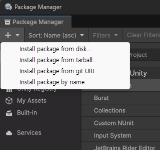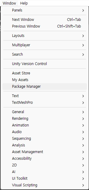 Unity 프로젝트에서 Window ⇒ Package Manager 창을 엽니다.