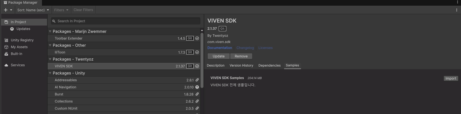 Window ⇒ Package Manager 에서 Viven SDK의 Sample Scene을 추가로 다운받을 수 있습니다.