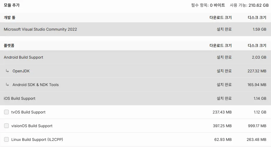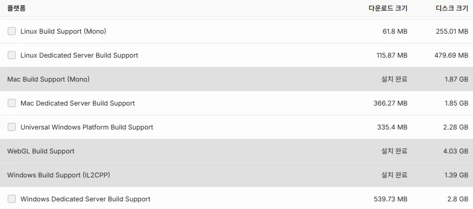 Android Build Support, iOS Build Support, Mac Build Support(Mono), Web Build Support, Windows Build Support (IL2CPP)